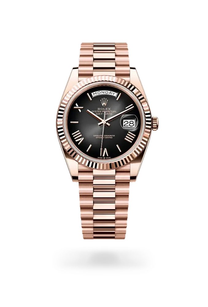 La declinazione presentata, realizzata in oro Everose 18 ct, esibisce un quadrante ardesia ombré, inedito per il colore che non era mai stato utilizzato prima su questi quadranti la cui superficie, colorata al centro, passa al nero più denso sul bordo, e per i numeri romani slegati sfaccettati e gli indici sfaccettati in oro rosa 18 ct. Fino a oggi, i quadranti ombré di Rolex esibivano diamanti incastonati a mo’ di indicatori delle ore ed erano riservati al Day‑Date 36. Questo quadrante s’inserisce nella continuità di un design svelato dal Marchio negli anni ’80, poi rilanciato nel 2019. La fabbricazione di questi quadranti con dégradé concentrico richiede l’applicazione di una lacca nera, un’operazione delicata controllata da un esperto e, se necessario, corretta in modo da ottenere una transizione armoniosa dal colore al tono scuro.