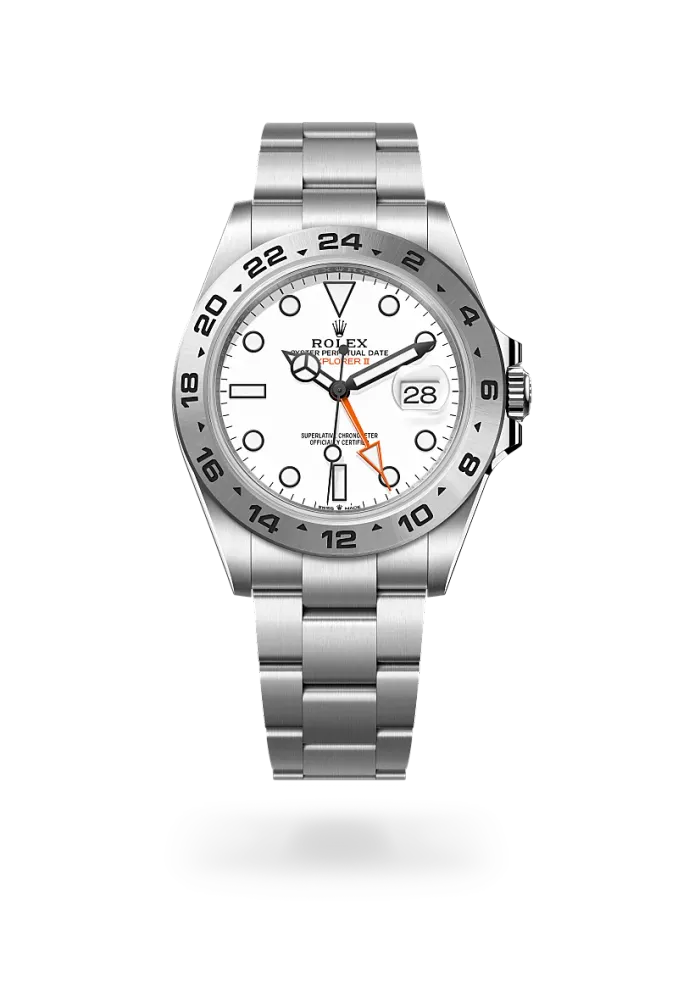 L’Explorer II indica la data e si differenzia per la lancetta supplementare 24 ore arancio e la lunetta fissa graduata 24 ore che permettono di distinguere inequivocabilmente le ore del giorno da quelle della notte. È diventato ben presto l’orologio di riferimento per speleologi, vulcanologi ed esploratori delle regioni polari. Gli indici delle ore e le lancette presentano la visualizzazione ad alta leggibilità Chromalight con materiale luminescente blu a lunga durata.