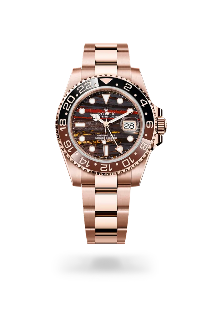 Questo GMT‑Master II presenta un quadrante in occhio di ferro. Questa roccia metamorfica cui Rolex ricorre per la prima volta su questo orologio si distingue per la ricchezza della sua texture. Composta di tre minerali, l’occhio di tigre, il diaspro rosso e l’ematite argentata, questa pietra esibisce riflessi dorati e arancio che, grazie a un accurato lavoro di selezione e assemblaggio, si abbinano armoniosamente al colore della cassa e del bracciale.