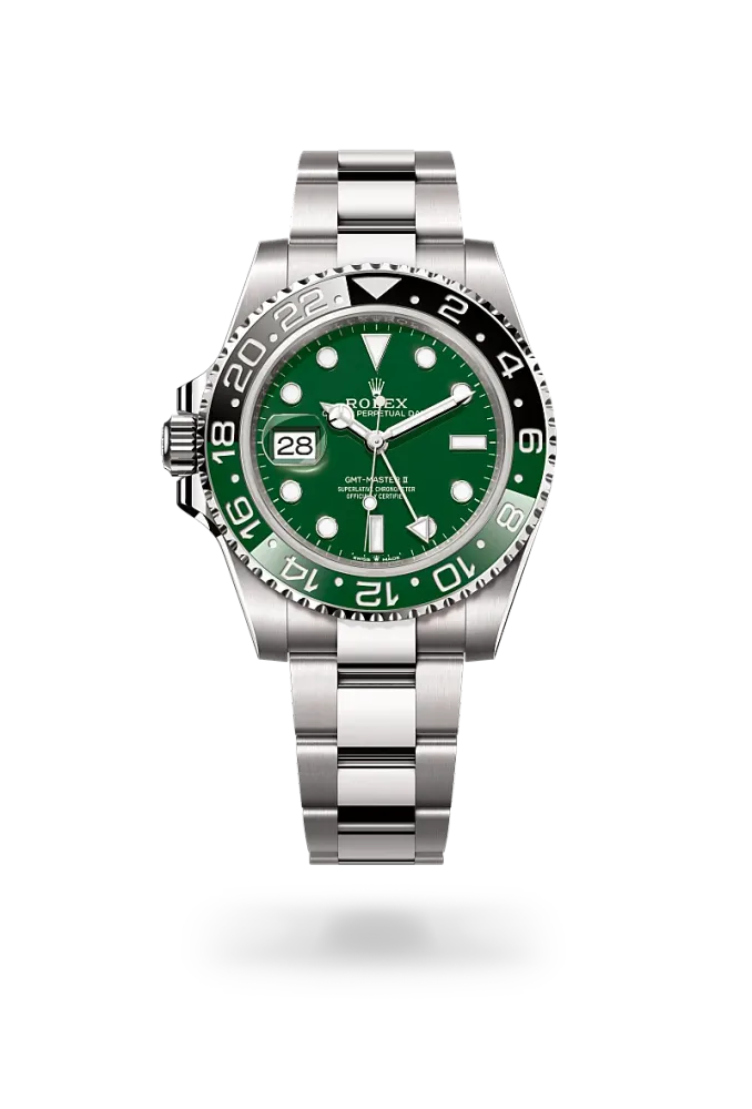 Questo modello presenta un quadrante nero e un disco della lunetta Cerachrom bicolore in ceramica marrone e nera. A completamento delle tradizionali lancette delle ore, dei minuti e dei secondi, il GMT‑Master II esibisce una lancetta supplementare con punta a triangolo che effettua un giro del quadrante in 24 ore, così come una lunetta girevole bidirezionale graduata 24 ore. Questa lancetta 24 ore dal colore intenso indica l’ora di riferimento di un primo fuso orario di origine, leggibile sulla graduazione della lunetta. In viaggio, l’ora locale è indicata sul quadrante tramite la tradizionale lancetta delle ore che può essere regolata con facilità, in entrambe le direzioni e a salti di un’ora, grazie a un meccanismo comandato dalla corona di carica. La regolazione dell’ora locale avviene in modo indipendente dalla lancetta dei minuti e dei secondi. Ciò permette ai viaggiatori di regolare il nuovo fuso orario senza dover rinunciare alla precisione del loro orologio.