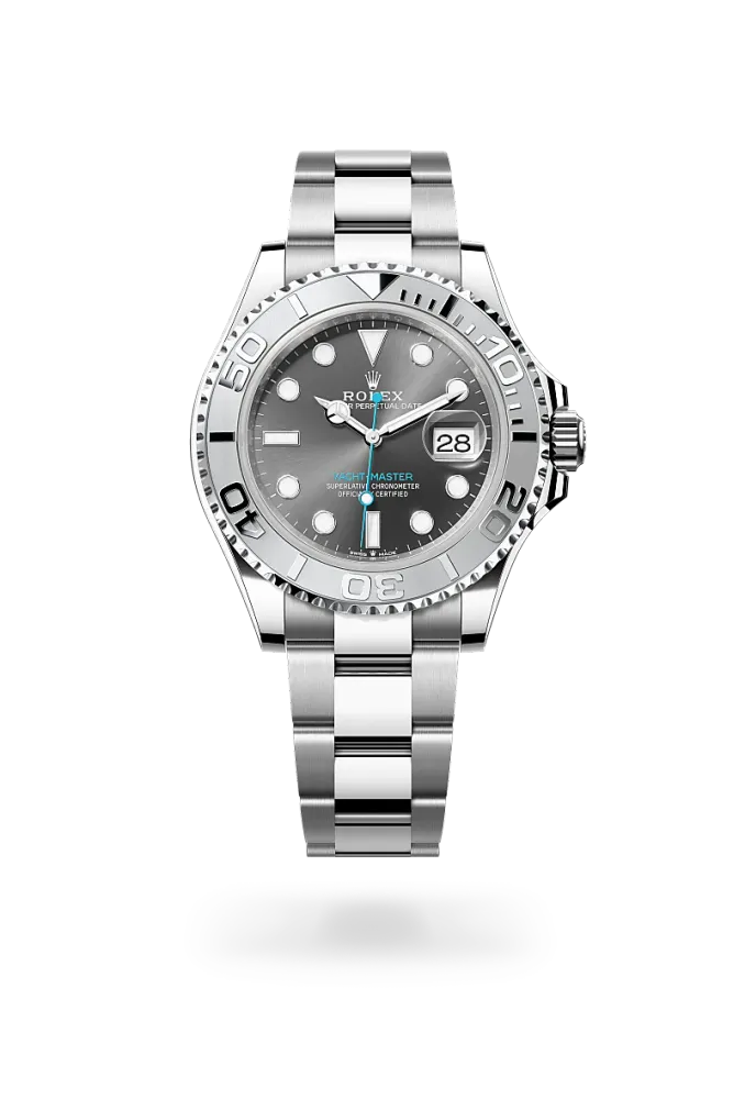 Molti orologi Rolex sono disponibili nell’ormai leggendaria combinazione di oro giallo, bianco o Everose e acciaio nota come Rolesor, ma il Rolesium è una creazione specifica, riservata esclusivamente allo Yacht‑Master. Mentre la cassa e il bracciale sono in resistente acciaio Oystersteel, la lunetta della versione Rolesium è realizzata in platino e conferisce all’intero orologio un candore argenteo e una vibrante luminosità, segni di un lusso inconfondibile.